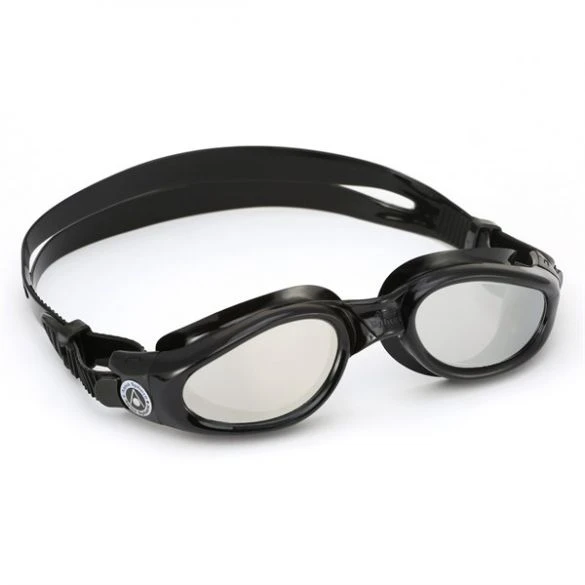 Deze Aqua Sphere Kaiman spiegellens zwembril zwart heeft spiegelglazen en een gekleurd frame.