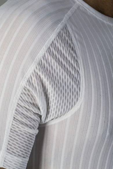 Het ademende materiaal op de rug en onder de oksels zorgt voor het lichte gewicht en een atletische pasvorm.